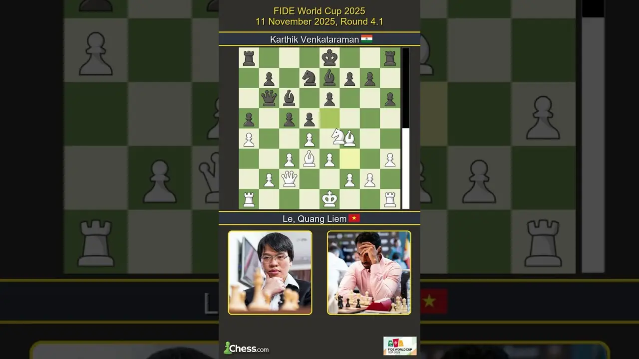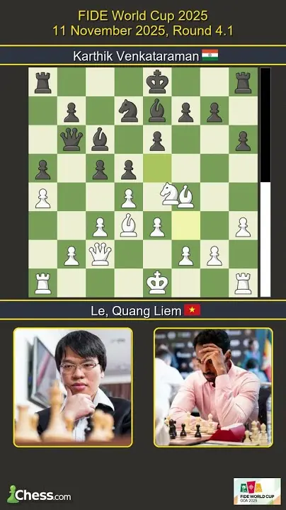 Tối 11-11, trận đấu đầu tiên tại vòng 4 World Cup cờ vua 2025 giữa đại kiện tướng Việt Nam Lê Quang Liêm và đối thủ người Ấn Độ Venkataraman Karthik đã khép lại với kết quả hòa sau 36 nước đi. Lê Quang Liêm cầm quân trắng và thi đấu rất thận trọng, thể hiện kinh nghiệm dày dạn trước một kỳ thủ cực kỳ khó chịu và đang có phong độ ổn định tại giải. Hai bên lựa chọn nước đi chính xác với tỉ lệ gần như hoàn hảo, lần lượt đạt 98,7% và 98,6%, khiến trận đấu trở nên chặt chẽ và không có sai sót lớn nào xảy ra.