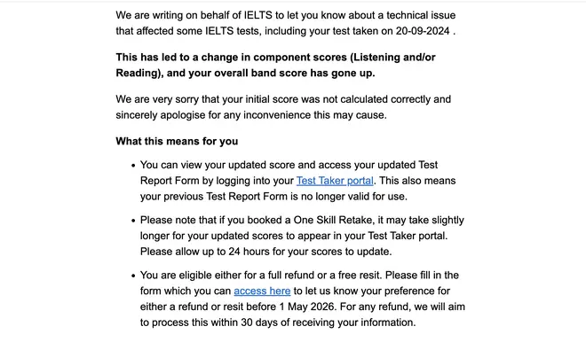 Từ giữa năm 2023 đến tháng 9/2025, nhiều thí sinh Việt Nam tham gia kỳ thi IELTS do Hội đồng Anh và IDP tổ chức đã bất ngờ nhận được email thông báo về việc chỉnh sửa điểm thi do một sự cố kỹ thuật nội bộ. Sự cố này chủ yếu ảnh hưởng đến điểm của các kỹ năng Nghe và Đọc, dẫn tới tăng hoặc giảm điểm, và đồng thời điều chỉnh tổng điểm của thí sinh.