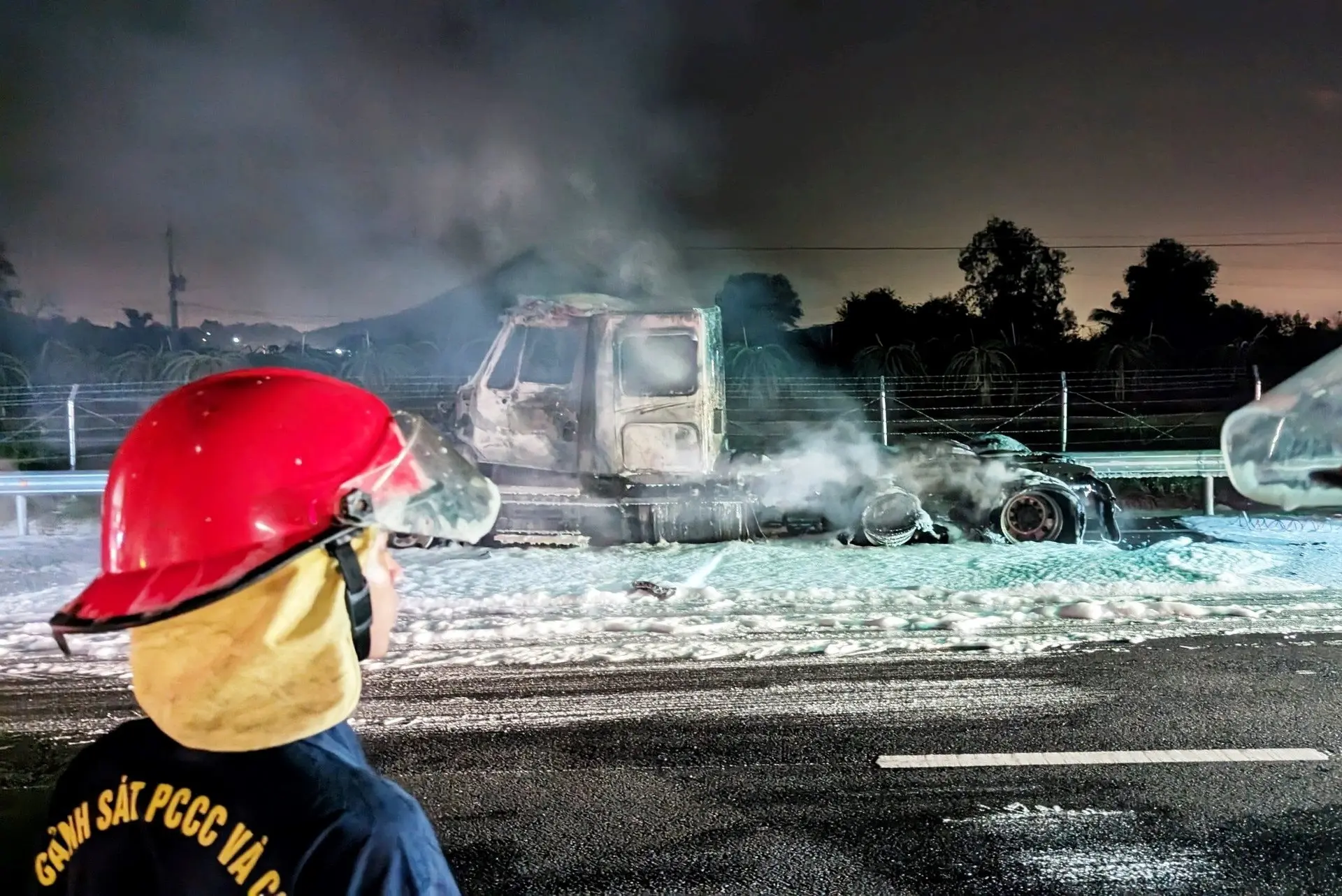 Xe container cháy rụi trên cao tốc Vĩnh Hảo – Phan Thiết